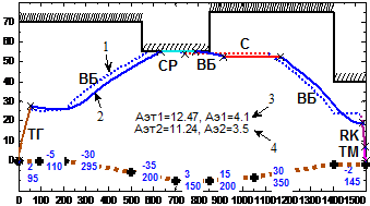 При наличии крутых спусков на перегоне режимы ВБ, СР на оптимальной траектории могут возникать внутри перегона. Если на перегоне существуют крутые подъемы, то на оптимальной траектории дополнительно может возникать режим ТГ внутри перегона. В процессе поиска точек переключения режимов следует отметить: