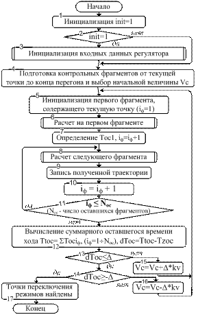 На рис. 12 представлена схема алгоритма РВХ. Работа главной процедуры в алгоритме РВХ (в блоке 6 на рис. 12) показана рис. 13. Процедура «Расчет на первом фрагменте перегона, содержащем в текущий момент времени координату головы поезда», реализует расчет энергооптимальной траектории и времени движения поездом по этому фрагменту. Режимы ведения поезда на оптимальной траектории по этому фрагменту выбираются следующие: