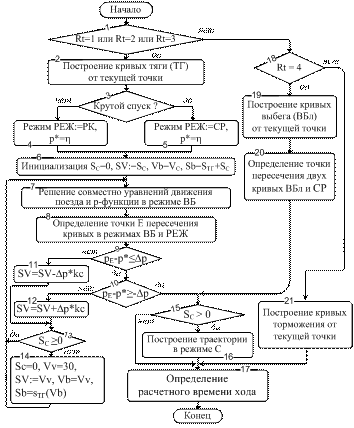 Следует отметить, что начальные условия р-функции для различных режимов зависят от предыдущего режима, ограничения скорости и профиля пути. На основе этого и начальных условий для режимов ВБ, РК или ТГ на оптимальной траектории решаем совместно систему дифференциальных уравнений движения поезда и р-функции в режимах ВБ, РК или ТГ (только при наличии крутого подъема). Если