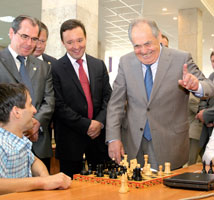В фойе глава республики осмотрел персональную выставку картин инвалида с детства Рената Мусина, который создает художественные произведения без помощи рук. А с неоднократным чемпионом мира и Европы по шахматам среди инвалидов с нарушениями опорно-двигательного аппарата Стасом Михеевым даже сыграл блиц-партию, подарив сначала плазменный телевизор.