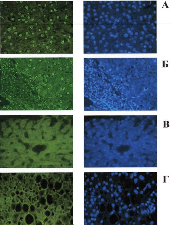 Так же как и при исследовании контрольных образцов, на всех препаратах биоптатов печени больных ХГ В и С была обнаружена выраженная экспрессия Fas (рис. 2 Б, В слева). Гепатоциты больных экспрессируют Fas главным образом в цитоплазме, иногда в виде зерен, и частично на мембране, причем примерно в равной степени как в перипортальной области, так и внутри дольки, вблизи центральной вены. Выраженная экспрессия Fas обнаружена среди клеток воспалительного инфильтрата (рис. 2 Б, В слева).