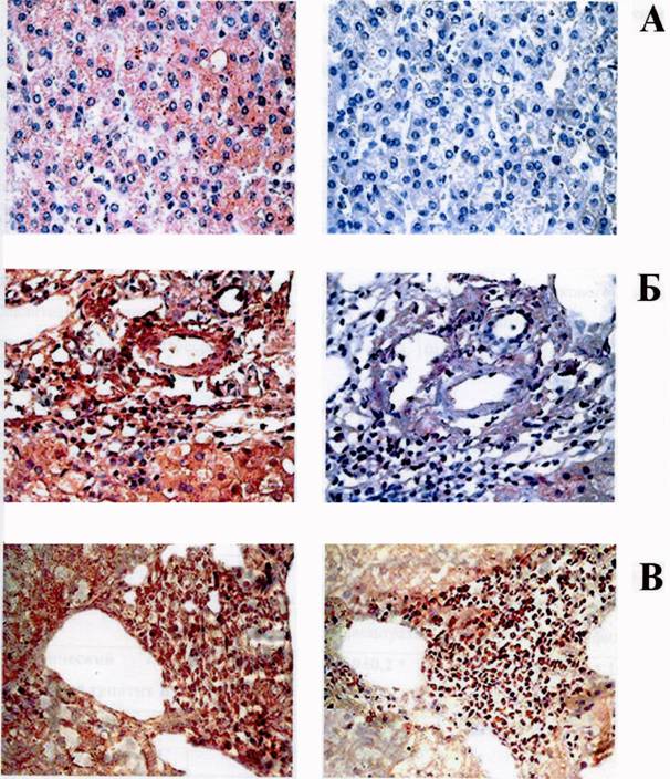 Рисунок 2. Экспрессия Fas и FasL гепатоцитами и клетками лимфоцитарного инфильтрата при хронических гепатитах В и С: нормальная печень (А); лимфогистиоцитарный инфильтрат при хроническом гепатите В (Б); лимфогистиоцитарный инфильтрат при хроническом гепатите С (В). Слева – окрашивание антителами к Fas, справа - к FasL, увеличение х 400.
