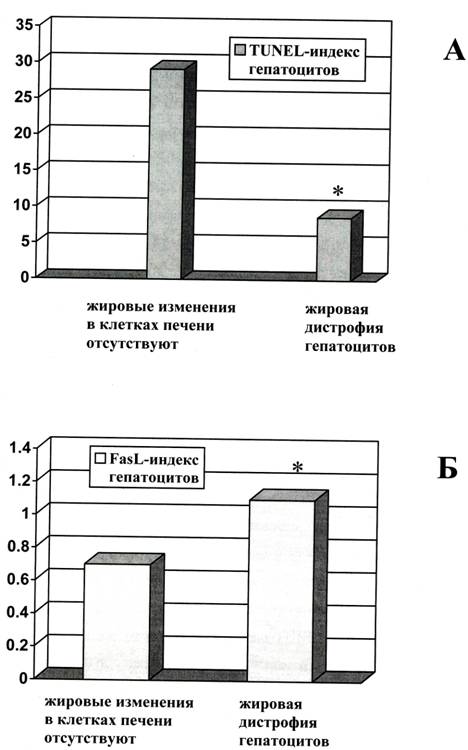 Рисунок 3. Связь уровня апоптоза гепатоцитов (TUNEL-индекс,%, А) и уровня экспрессии FasL на гепатоцитах (FasL-индекс, усл. ед., Б) больных хроническими гепатитами В и С с наличием жировой дистрофии гепатоцитов.