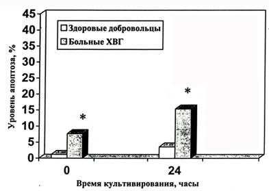 Рисунок 4. Динамика апоптоза лимфоцитов периферической крови здоровых добровольцев и больных хроническим вирусным гепатитом непосредственно после выделения и через 24 ч инкубации в культуральной среде