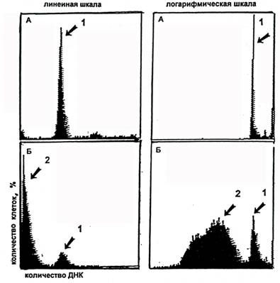 Регистрация апоптоза клеток осуществлялась с помощью проточной цитофлуориметрии после окрашивания ДНК йодистым пропидием в качестве флуорохрома и измерением процента гиподиплоидных клеток на проточном цитофлуориметре-сортировщике клеток EPICS. Процент клеток в состоянии апоптоза (процент гиподиплоидных клеток со сниженной по сравнению с диплоидными флуоресценцией ДНК) подсчитывали по программе STAT PACK, анализируя флуоресценцию не менееклеток в каждом образце.