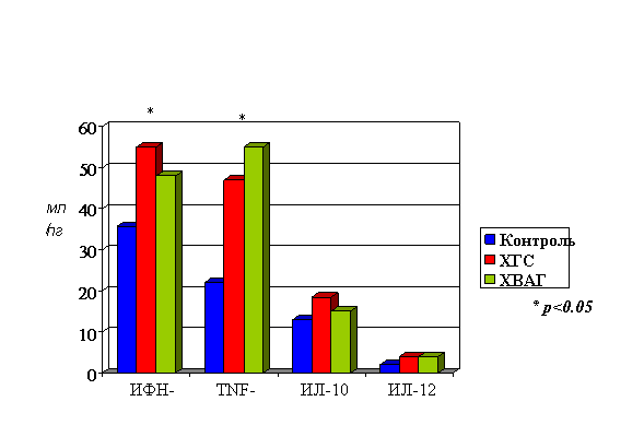 Концентрацию цитокинов ИЛ-10, ИЛ-12, TNF-α, ИФН-γ в сыворотке крови больных ХГ С и пациентов контрольной группы определяли методом иммуноферментного анализа. Для исследования концентрации ИЛ-10, ИЛ-12 использовались коммерческие тест-наборы фирмы «Immunotech» (Франция) и «Протеиновый контур» (Санкт-Петербург), для исследования концентрации TNF-α и ИФН-γ – тест-наборы фирмы «R&D Systems Europe» (США) и BioSource (ФРГ). Исследование осуществлялось в лаборатории патологии эритрона клиники химиотерапии лейкозов ГНЦ РАМН вед. н. с., к. б.н. и вед. н. с. ГНЦ РАМН, д. б.н. .