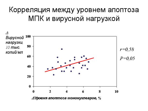 Рисунок 11. Корреляция уровня апоптоза мононуклеарных лейкоцитов периферической крови больных хроническим гепатитом С с уменьшением вирусной нагрузки через 2 нед противовирусной терапии.