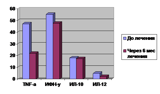 На фоне 24-недельной комбинированной ПВТ зафиксировано достоверное снижение сывороточной концентрации TNF-α (рис. 12). Значимой динамики уровней других определявшихся цитокинов (ИЛ-10, ИЛ-12, ИФН-γ) не отмечено.