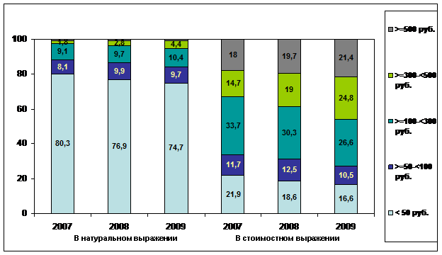>=100-<300 руб. 9,1 9,7 10,4 33,7 30,3 26,6