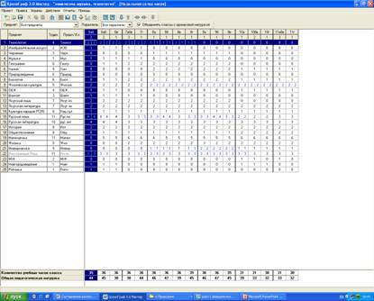 Заполнив все нужные поля, можно дать команду «Предварительный расчет расписания». Программа составляет расписание на 80-90%. Внимательно просмотрев, проверив проставленные уроки нужно скорректировать расписание вручную, т. к. компьютер полностью не ставит уроки, не учитывает загруженность учителя, очередность уроков по дням недели и т. п.