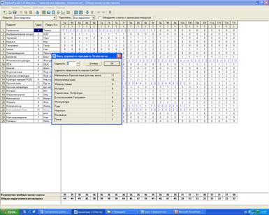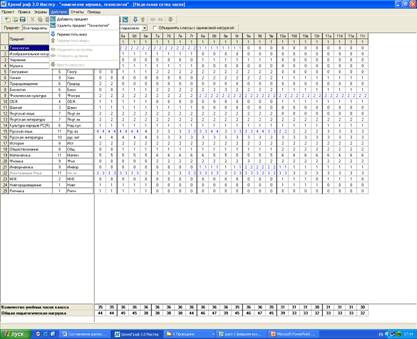 где заполняется данные об образовательном учреждении, расписание звонков, количество занятий, продолжительность занятий и перемен, список иностранных языков, классы и их параллели, количество девочек, мальчиков, общее количество учащихся. На недельной сетке наведением курсора на нужную ячейку и нажатем кнопки «пробела» ставим пометку на место (ячейка при этом окрасится в розовый цвет), во время которого не ставится урок. Так мы пометили место, во время которого будут проводится классные часы (например, понедельник - 6-е уроки).