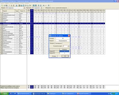 Во вторых, заполняем рабочее поле «Недельная сетка часов» (рис 3), где, согласно учебному плану, ставим количество часов в неделю по каждому классу и предмету. В меню «Действия» добавляем нужный предмет (или удаляем) (рис.4). В расписании мы проставили только аудиторные часы, не включили часы внеаудиторных занятий, для которых составили отдельное расписание. Программа автоматически суммирует общее количество часов отдельно по классам, что очень удобно для проверки. В классах, где есть деления на подгруппы, путем наведения курсора на нужную ячейку, нажатия правой кнопки мыши выбираем команду «разделить на группы», заполняем появившееся окно (рис 5).