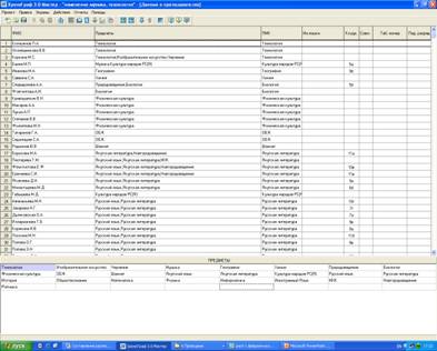 В третьих, заполняем рабочее поле «Данные о преподавателях», где в появившихся колонках, напротив колонки «ФИО преподавателей», двойным щелчком выбираем из списка предметов, нужный предмет (рис.7)