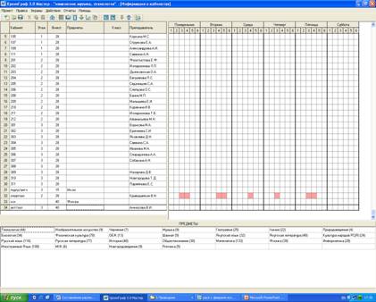 В четвертых, заполняем рабочее поле «Информация о кабинетах», где заполняем таблицу согласно распределению кабинетов по школе. На недельной сетке, наведением курсора на нужную ячейку и нажатием кнопки «пробела», ставим пометку на место (ячейка при этом окрасится в розовый цвет), во время которого кабинет должен быть свободным. Так, мы пометили в спортзале места, в которых проводятся уроки физкультуры в начальных классах и не должны проводиться уроки физкультуры в других классах. (рис. 8)