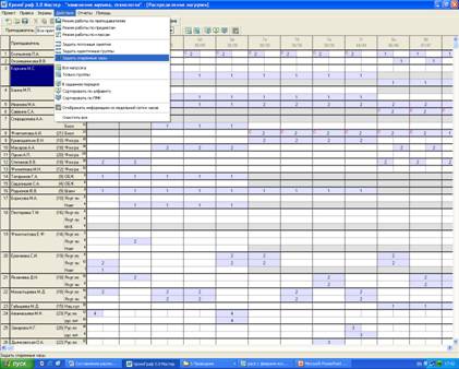 В пятых, заполняем рабочее поле «Распределение нагрузки», где согласно комплектованию, двойным щелчком ставим количество часов по каждому учителю. В меню «Действия» задаем спаренные уроки там, где это требуется. (рис.9)