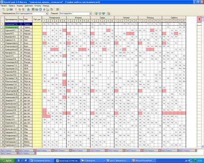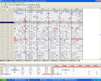 В шестых, заполняем рабочее поле «График работы преподавателей», где на недельной сетке наведением курсора на нужную ячейку и нажатием кнопки «пробела» ставим пометку на место (ячейка при этом окрасится в розовый цвет), во время которого учитель должен быть свободным (рис 10). В нашем случае, такими «свободными» помечены уроки учителей, которые в это время преподают в начальных классах, также первые уроки учителей, которые отводят в это время детей в детский сад.