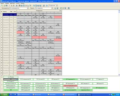 После того, как все уроки согласованно проставлены, в меню «Действия» выбрать режим «Кабинеты» и двойным щелчком проставить из списка нужный кабинет, учитывая закрепление кабинетов за предметами, учителями. Свободные кабинеты останутся с зеленым цветом. (рис. 11)