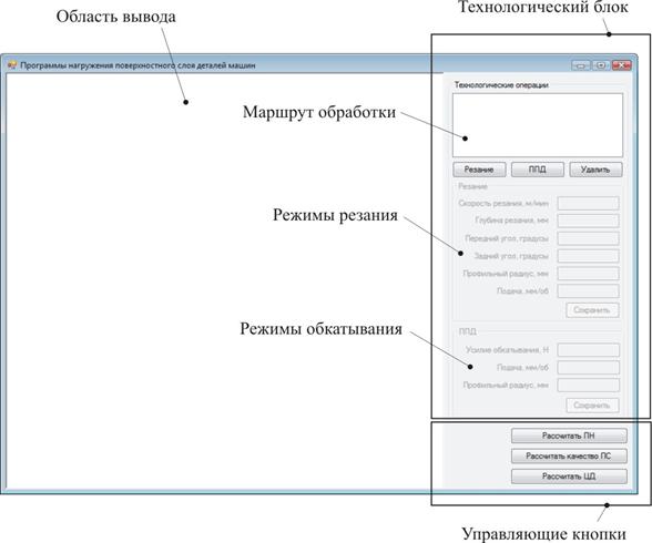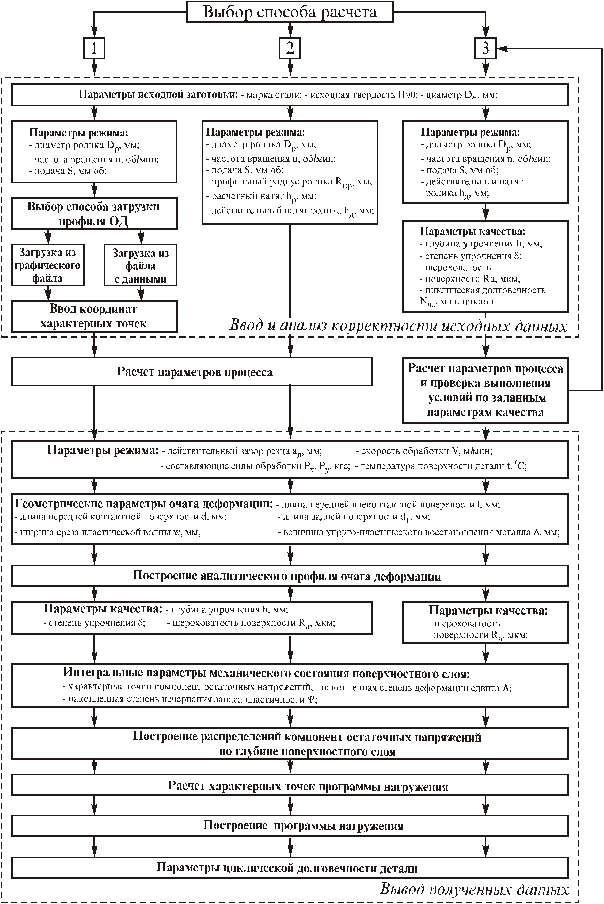 Программная система позволяет формировать произвольный маршрут обработки, задавать значения режимов резания и обкатывания, рассчитывать программы нагружения, параметры состояния качества поверхностного слоя после обработки и долговечность изделия, обработанного по заданному маршруту и режимам.