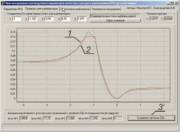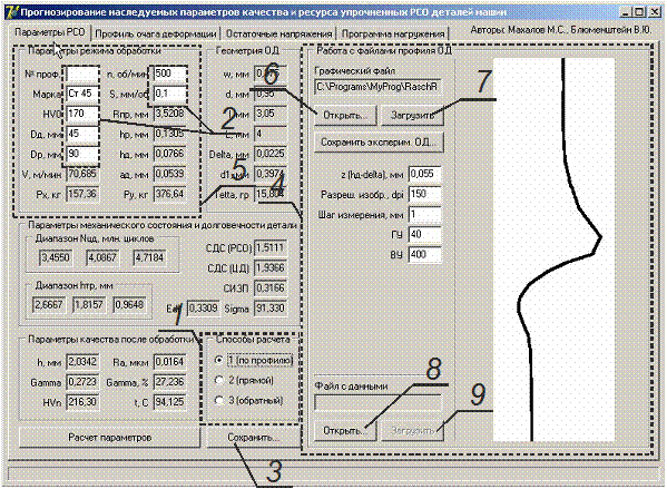 В процессе работы программа рассчитывает по известным остальные (неизвестные) параметры процесса РСО и строит графическое изображение профиля ОД. Затем осуществляется построение распределений компонент остаточных напряжений и программы нагружения для данного режима обработки. Существует возможность сохранения рассчитанных параметров в файл отчета текстового формата (поз. 3, рис. 1.2), а полученных распределений в текстовые файлы с координатами точек (поз. 3, рис. 1.3 и поз.1, рис. 1.4).