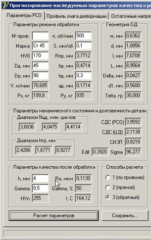 На основе полученных в зависимостей на языке Delphi 7 разработана программа, позволяющая моделировать процесс обработки размерного совмещенного обкатывания (РСО) и расчетным путем определять долговечность и назначать оптимальные режимы обработки детали [1].