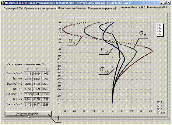 Наряду с расчетами в обоих случаях осуществляется построение аналитического профиля ОД (поз. 2, рис. 1.3), осуществляется расчет координат характерных точек и построение распределения компонент тензора остаточных напряжений по глубине поверхностного слоя (рис. 1.5). В этом же разделе программа индицирует глубины расположения и значения напряжений в характерных точках эпюр ОН.