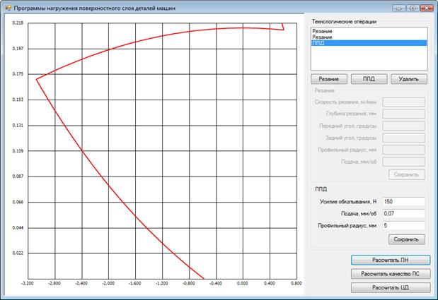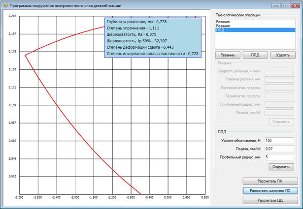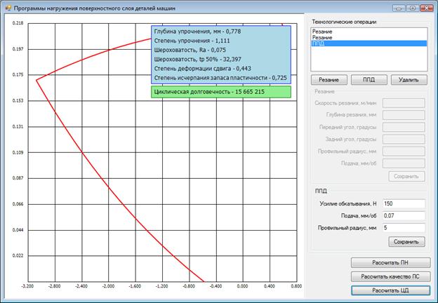 Разработанный алгоритм решения прямой задачи технологического обеспечения долговечности изделия был реализован в виде программной системы «Программа нагружения поверхностного слоя деталей машин».