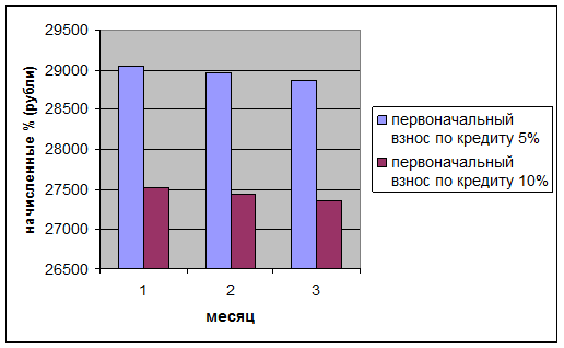 Выше предлагаемое условие, что касаемо понижения первоначального взноса по кредиту, отрицательно на прибыли банка никак не скажется, а наоборот даже таким образом, увеличится сумма кредита, а за счет этого и доход банка. В среднем, квадратный метр однокомнатной квартиры по г. Москве стоитруб., следовательно, предположим, что квартира стоит 3 руб. на 30 лет под 12% годовых, мы выдает клиенту 95% стоимости (т. еруб.), Таким образом, из табл. 14 видно: разница в платежах по процентам между данной суммой кредита и 2 руб. составит 4 574 руб. по расчетам в квартал, что показано на рис. 9.
