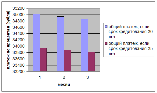 Так же предлагается увеличить срок кредитования до 35 лет для молодых семей. В данном случае если клиент будет покупать квартиру в сумме 3 руб. на 35 лет, но с первоначальным взносом, как и в настоящее время, 10%, Банк опять-таки остается в прибыли, а так же минимизирует риск, так как, увеличивая срок кредитования, уменьшается постоянный платеж по кредиту, что и отражено в табл. 17 и показано на рис. 10.