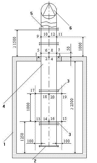 1 - печь; 2 - воздуховод, 3 - уплотнение места проходки воздуховода через ограждающую