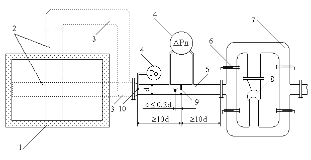 7- воздуховоды обвязки вентилятора; 8 - вентилятор; 9 - расходомерная диафрагма;