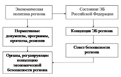 На рис.1 представлена принципиальная схема реализации экономической политики региона. Она включает в себя ряд звеньев: концепция ЭБ региона, Совет безопасности региона и др.