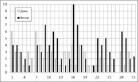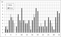 Рис.4. Суточные флуктуации температуры в марте a) 2010 г. и b) 2012 г. (По вертикали отложены значения разности температур день – вечер, вечер – следующий день в °С, по горизонтали – дни месяца.) |