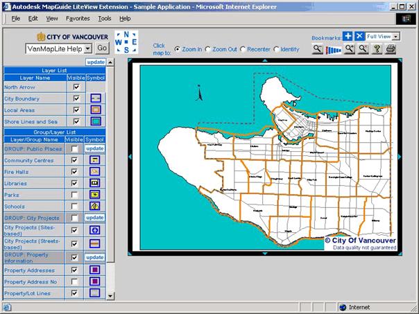 Программный продукт Autodesk Map Guide предназначен для публикации карт в Интернете. С помощью программы Autodesk Map Guide Author карты готовятся к публикации. С её помощью можно добавить новые слои на карту и задать параметры их визуализации. В дальнейшем подготовленная карта помещается на Web-сервер для её просмотра обычными браузерами Интернет (рис. 7.14).