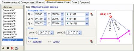 Результирующую точку определяют два угла. Значения этих углов вводятся в поля «Угол 1-2» и «Угол 2-3». Также можно указать искомую точку на плане (