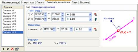 Затем в полях «Из точки:» X и Y задаются координаты точки, из которой нужно опустить перпендикуляр на линию створа. Точка пересечения линии перпендикуляра с линией створа является результирующей точкой.