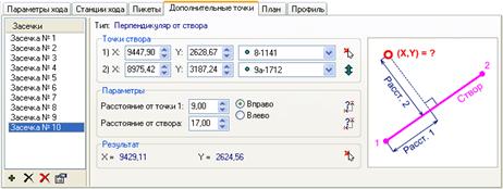 Перпендикуляр в створ. Сначала задаются точки створа (рис. 8.22). Можно ввести в поля X и Y в разделе «Точки створа» известные координаты точек, задать ссылки на существующие в журнале точки или оттрассировать точки створа по карте (
