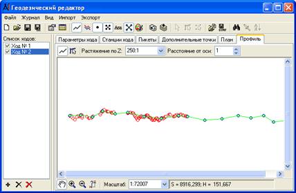 В верхней части окна находятся параметры, позволяющие задать масштаб отображения растяжения по Z и расстояние от оси, определяющее ширину коридора вдоль оси, в котором отображаются пикетажные точки.