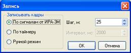 1. По сигналам от ИРА-3М. При выборе этого варианта очередной кадр фиксируется при прохождении определенного участка пути. Сигнал о наступлении такого события поступает от устройства ИРА-3М, которое снимает показания с датчика пути. Интервал, с которым кадры записываются в видеоряд, задается в поле Шаг.