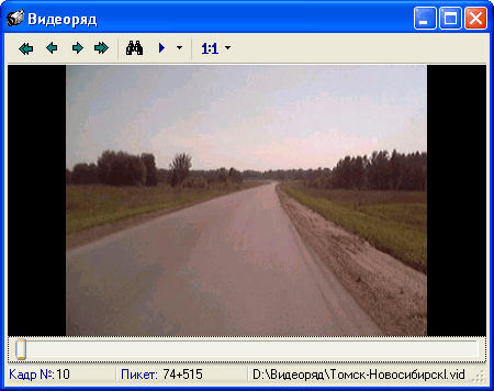 Для того чтобы просмотреть видеоряд, привязанный к объекту на карте, нужно выполнить следующие действия: 1) перейти в режим Просмотр видеоряда; 2) указать мышью трассу, для которой будет осуществляться просмотр видеоряда; 3) если существует видеоряд, привязанный к указанной трассе, то будет открыто окно просмотра видеоряда.