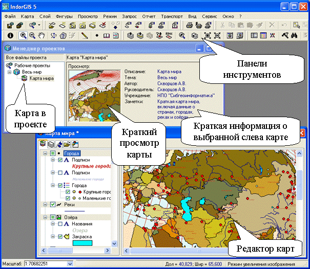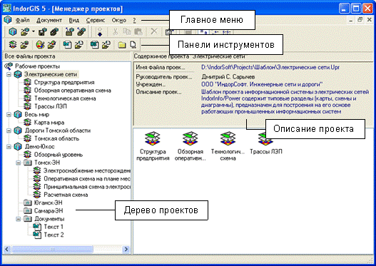 Основным рабочим пространством в ГИС IndorGIS является проект. Каждый проект может содержать множество различных карт, текстовых документов, графических изображений, баз данных и пр.