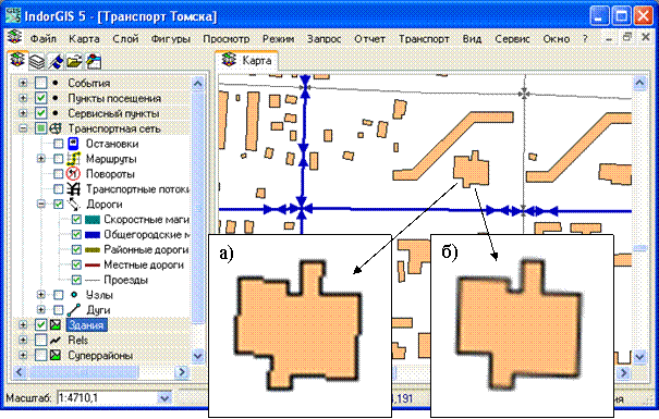 Ещё одной отличительной особенностью IndorGIS является высочайшее качество карт, выводимых на экран, за счет сглаживания лестничного эффекта. При этом человеческий глаз практически не может заметить пиксельной природы изображения на экране (рис. 9.2).