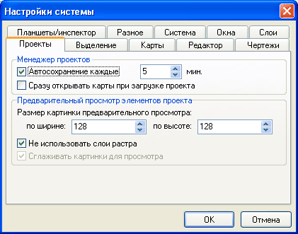 Настройка… в меню Сервис (рис. 9.10). В этом окне можно задать параметры предварительного просмотра документов проекта, включить автосохранение проектов и создание резервных копий слоев, задать способ выделения объектов на карте (цвет, которым отображаются выделенные объекты, форма узловых точек и т. д.), установить планшетную привязку, задать автоудаление близких вершин в полилиниях и полигонах, способ отрисовки ex-шрифтов, режим отрисовки растров, максимально возможное количество откатов при редактировании фигур на карте, уровень детализации при ведении журнала событий и файл, в котором он размещается, и т. д.