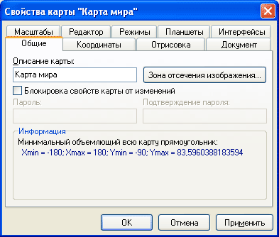 В этом окне можно получить краткую информацию о карте: тему, автора, руководителя, учреждение, в котором выполнен документ; задать описание карты, отображающееся в менеджере проектов, заблокировать свойства карты от изменений, указать зону отсечения изображения. Зона отсечения определяет область, за пределами которой изображение карты не рисуется.