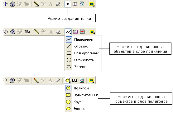 Создание новых объектов осуществляется в специальном режиме. Этому режиму соответствует кнопка на панели инструментов Режимы работы (рис. 9.15). Набор объектов, которые могут быть созданы на карте, зависит от того, какой слой в данный момент является активным. Если в активном слое могут присутствовать несколько типов объектов, то кнопка, соответствующая режиму создания новых объектов, содержит всплывающую панель инструментов.