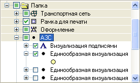 Для примера, создадим на карте Томской области новую автозаправочную станцию. Для этого нужно выделить в дереве слоев точечный слой АЗС (рис. 9.16). Этот слой представляет автозаправочные станции на территории Томской области. Затем нужно выбрать режим создания точки (см. рис. 9.15). После этого надо щелкнуть мышью в том месте на карте, где должен располагаться точечный объект. Созданный точечный объект отображается на карте в соответствии с настройками визуализации слоя.