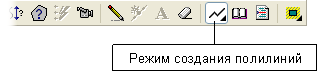 Для примера нарисуем ось некоторой улицы на карте города. Для этого нужно выделить слой полилиний, представляющий оси, включить режим создания полилинии (рис. 9.21), а затем последовательными щелчками мыши введите узловые точки полилинии (рис. 9.22). На карте при этом отображается фигура, представляющая набор сегментов, соединяющих соседние узловые точки. Когда будет указана последняя узловая точка полилинии, нужно нажать правую кнопку мыши или клавишу Enter для завершения ввода объекта.