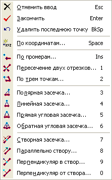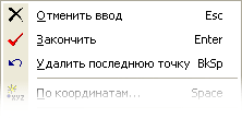 Способ задания очередной узловой точки выбирается из контекстного меню. Следует заметить, что его можно вызвать только в процессе создания объекта (то есть должна быть введена хотя бы одна узловая точка полилинии или полигона).