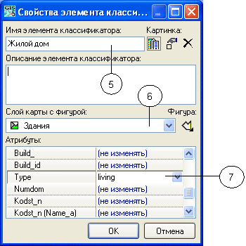 В списке Атрибуты отображаются все атрибуты выбранного слоя. Для тех атрибутов, значения которых должны заполняться автоматически при создании объекта, необходимо ввести в этом списке нужные значения. В данном примере объекты в слое здания классифицируются по одному атрибуту (по типу зданий). Поэтому введёме в поле Type значение атрибута, которое определяет здание как жилое, после чего нажмём кнопку ОК.
