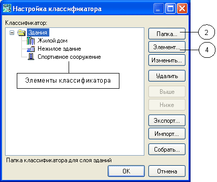 Настройка классификатора…. В этом окне создадим папку классификатора для слоя зданий. Для этого надо нажать кнопку Папка… в окне настройки классификатора. В появившемся окне надо ввести название папки классификатора, краткое описание папки и нажать кнопку ОК.
