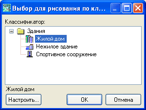 Теперь рассмотрим собственно ввод фигур по классификатору. Для примера нарисуем на карте ряд зданий, каждое из которых является жилым домом. Чтобы не выставлять для каждого вновь созданного объекта значение атрибута Тип здания, используем режим ввода фигур по классификатору. Для этого надо включить режим ввода фигур по классификатору, затем в открывшемся окне выбрать элемент классификатора Жилой дом и нажать кнопку ОК (рис. 9.29).